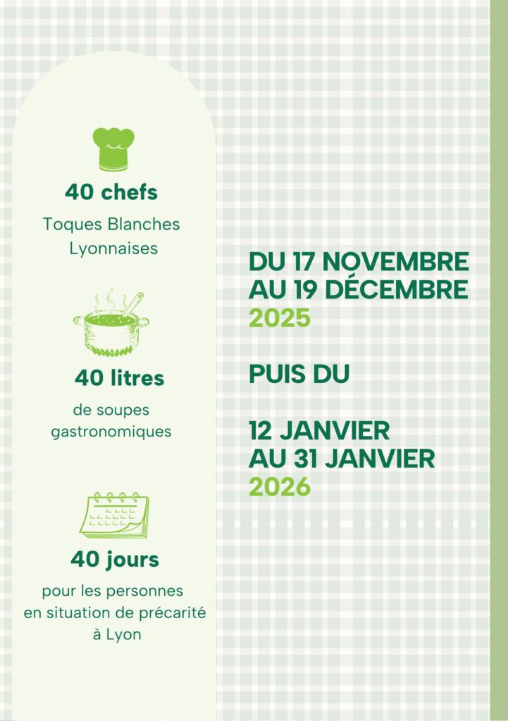 Ainsi, 40 chefs Toques Blanches Lyonnaises s’engagent à cuisiner 40 litres de soupe pendant 40 jours pour les offrir à des personnes en situation de précarité ou d’isolement de la Métropole de Lyon. Pour faire concrètement rimer gastronomie et solidarité, chaque chef offre sa soupe à une association sélectionnée par la Fondation pour son engagement sur le territoire.