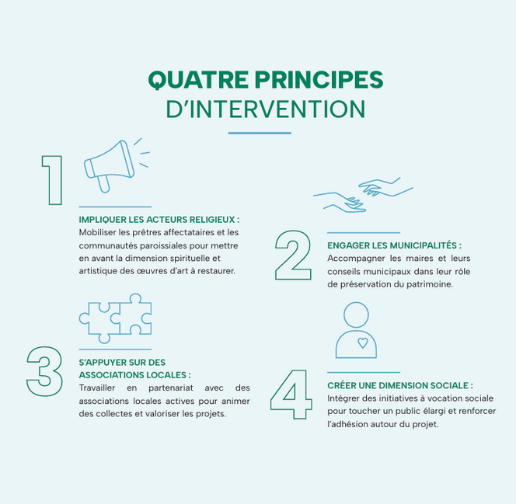 La mission de la Fondation s’articule autour d’un mode d’action spécifique, fondé sur son ancrage diocésain, social et territorial. Elle se positionne comme un catalyseur, cherchant à mobiliser les énergies locales tout en intégrant une dynamique sociale et inclusive. Cette approche doit garantir que la préservation du patrimoine dépasse la simple dimension matérielle pour devenir un projet collectif et fédérateur, au service du bien commun.